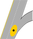 a westbound vehicle (blue dot in the center of the red circles) exits to